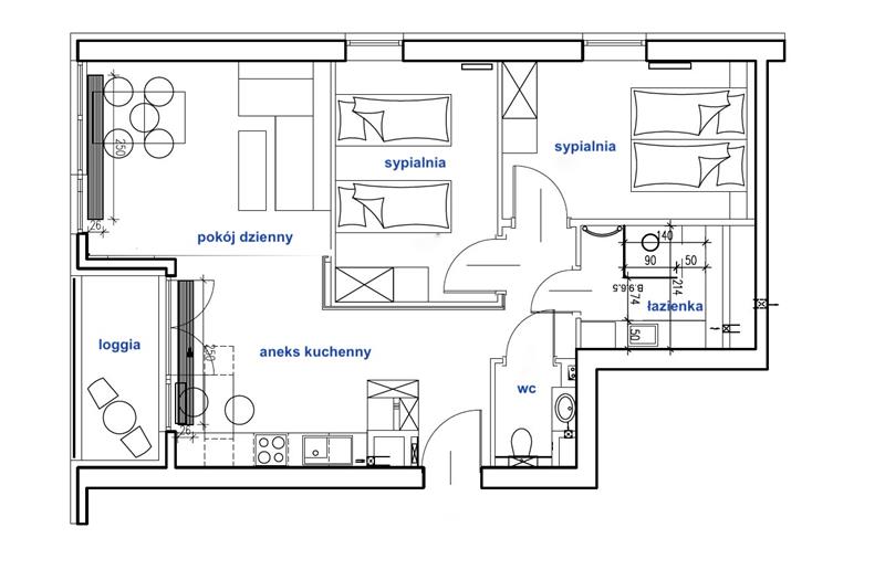 - Przestronny salon z aneksem kuchennym i wyjściem na loggię (ekspozycja zachodnia),