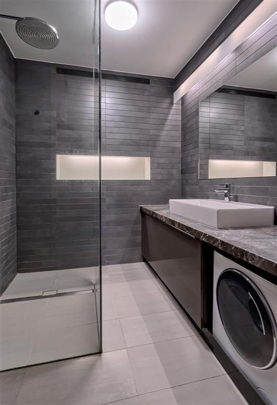 - Łazienka z kabiną prysznicową, wyposażona w pralkę,